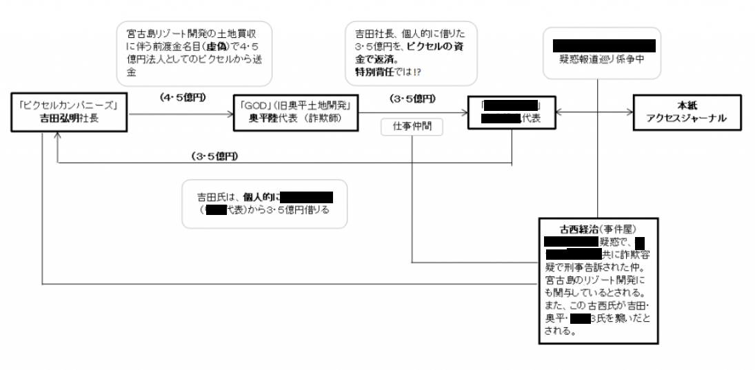 もっとも、先の特別調査委員会の報告書、イニシャルだらけで誰が誰かなどよくわからないが、その報告書によれば、奥平陸氏(=冒頭右写真。ピクセルエステートからの宮古島リゾート開発資金名目が虚偽だったことが今回調査で判明)がオーナーの「GOD」なる会社が3億5000万円の受け皿で、そのGODからリゾート開発資金としては使われず(特別損失を計上)、A社にバックされていた。