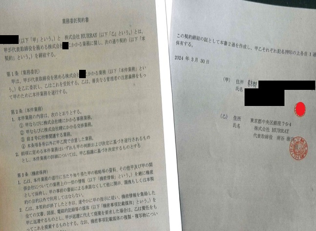 B氏は後で知るのだが、それは弁護士との契約書ではなく、南谷氏が代表のHURRAYとの「業務委託契約書」。