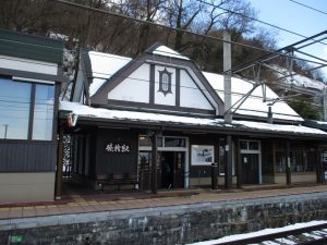 1時間に1本の鈍行(各駅停車)は急傾斜の山の斜面を走る。勾配はキツい。高度が上がってくると千曲川を真ん中に善光寺平の眺望が車窓に展がってくる。