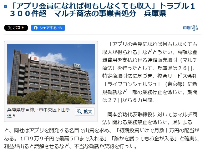 「ライフコンシェルジュ」(東京都文京区)という連鎖販売取引(マルチ商法)の会社につき、兵庫県立消費者総合センターが同県内での6カ月の取引等停止を命じたのは2022年8月のことだった(冒頭写真=「神戸新聞」22年8月26日)。