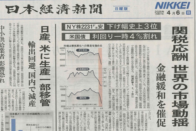 ここまで日経平均株価の最高値は、昨年7月11日につけた42,427円で、特に今年に入っても高値40,300円ラインがあっての34,000円ならば、だいたい20%程度の調整ができており、底値は近いと感じてしまったこともある。前稿で、わざわざ各国の報復行為を確認してから動けと書いていたのにだ。