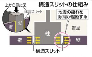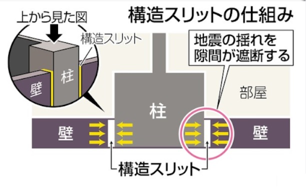 この構造スリット設置は1981年の建設基準法「新耐震基準」から採用され、阪神淡路大震災(1995年)を契機に耐震設計の一手法として本格的に採用されているという。