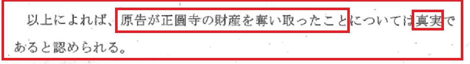 大阪地裁での仮処分に続き、東京地裁での一審判決(本紙YouTube版で詳報)も、記事は真実ないし真実相当性があるとして、6本とも削除する必要はないとしたが、中でも最大の争点だった「お寺乗っ取り疑惑」との記述につき、一審判決は、「原告が正圓寺の財産を奪い取ったことについては真実であると認める」(下写真=判決文より)と、疑惑どころか、“お寺乗っ取り”は真実であると認めていた。