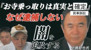 1本は、本紙アクセスジャーナルの記事が事実無根だとして中務稔也氏に記事削除請求されていた名誉毀損訴訟につき、「お寺乗っ取りは真実である」との裁判所判決が確定した件。