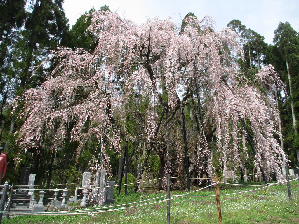圧巻のしだれ桜の樹下を見ると、墓がある。墓地の桜は田舎ではよく見る風景である。