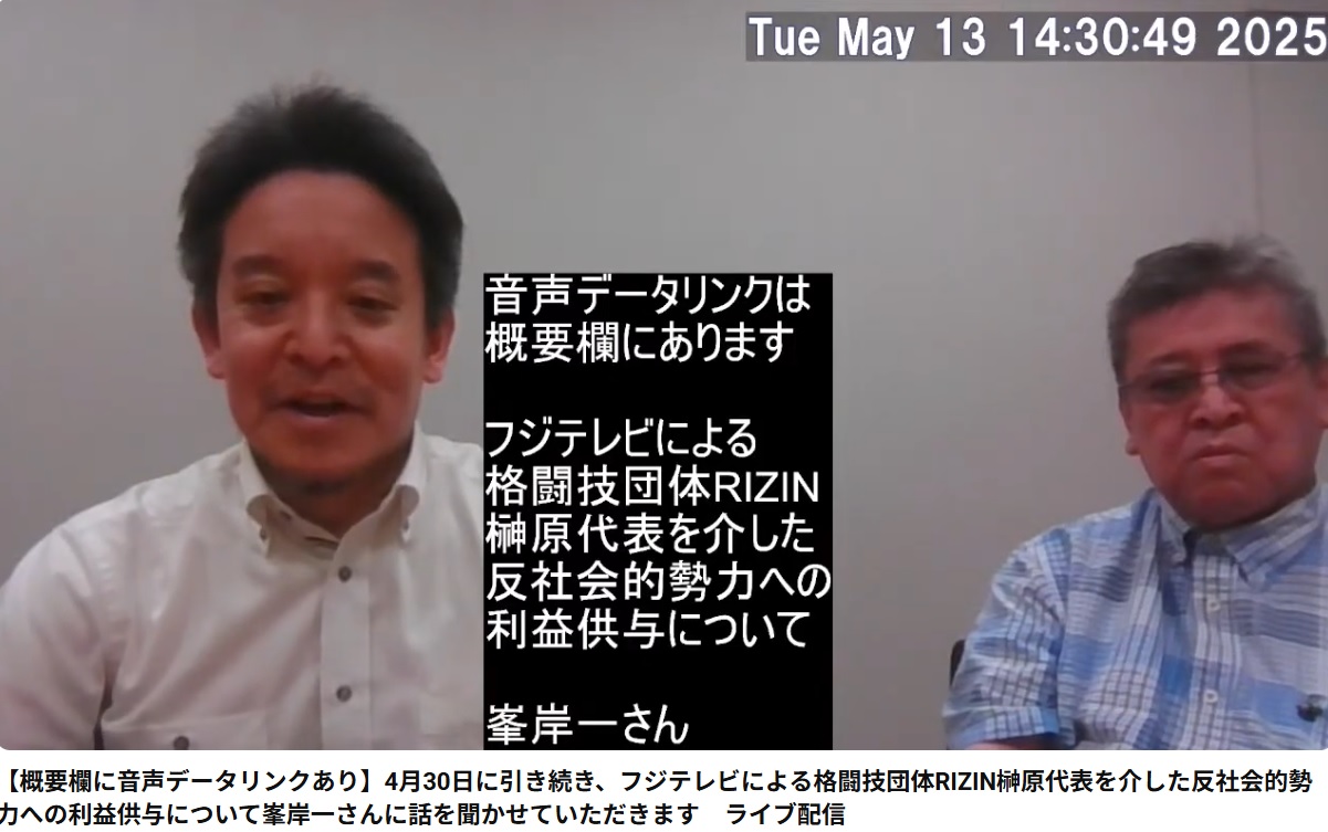 なぜなら、この2度目のYouTube生番組の概要欄に、RIZINが反社会勢力側から運営資金を借りトラブルになったこと、その結果、反社会勢力側がフジTVに対しそんなところの放送をするのかと圧力をかけたため社内調査が行われたもののゴールデンタイム枠での放送を復活させるために反社会勢力側を利した疑惑、さらにRIZIN側にもそうした反社会勢力を押えるための反社会勢力と言ってもいい者が裏顧問として付いていることを物語るなどの音声記録が聞けるようになっているからだ(ギガファイル4つ。計30分ほど)。