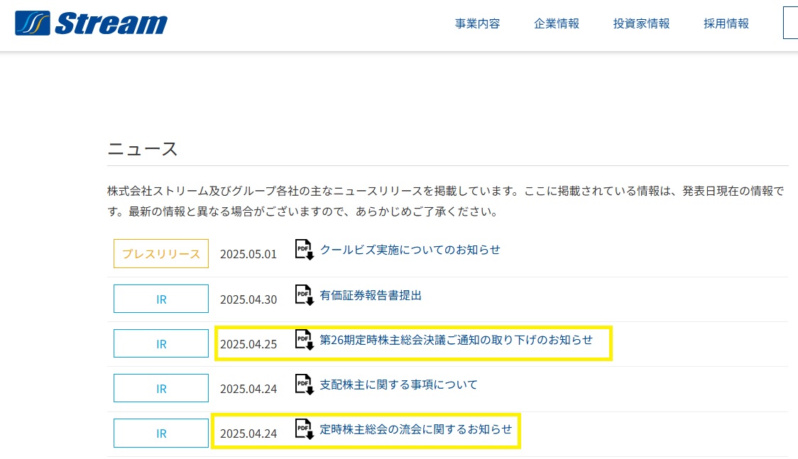 ただし、ストリームのHPも見てもそんなことはまったく載っておらず、4月24日定時総会後の人事に関するIRといえば、同日、総会は流会になった、翌25日、取締役6人選任の件は審議・採決に至らなかったとIRされているだけだ。