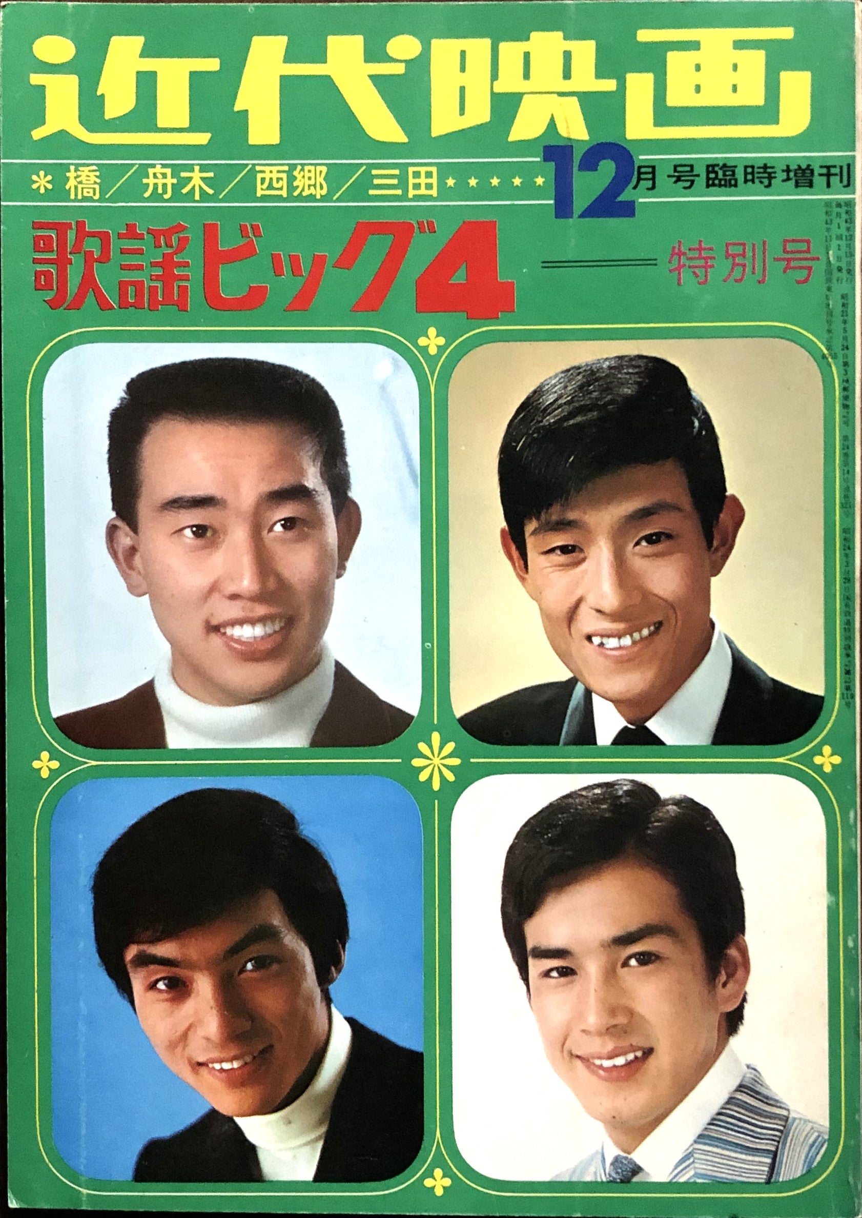 当時「四天王」とは人気絶頂の、橋幸夫、舟木一夫、西郷輝彦、三田明の4人のことだった。1960年代、特に63~66年あたりは、10代の女子たちのほとんどがこの4人の誰かに夢中になっていた。あの頃の芸能誌『平凡』や『明星』(月刊と週刊と両方あった)の表紙を毎号のように飾っていたっけ。ちなみに最初は、橋・舟木・西郷の「御三家」だったのだが、後発の三田明が加わって「四天王」となったようだ。