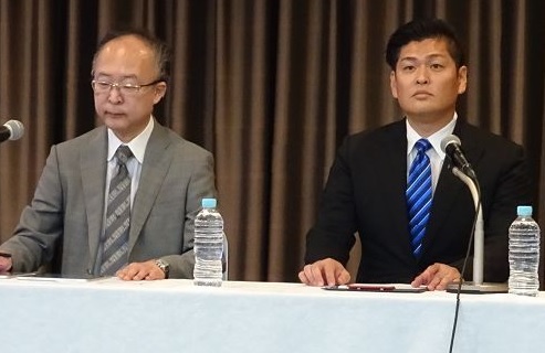6月6日、本紙の予想通り、脱毛サロン「ミュゼプラチナム」の運営会社「MPH」の高橋英樹社長(冒頭写真右人物。左は弁護士)が記者会見し、同社株主総会で6月2日付で同社の解散を決めたことを明らかにした。