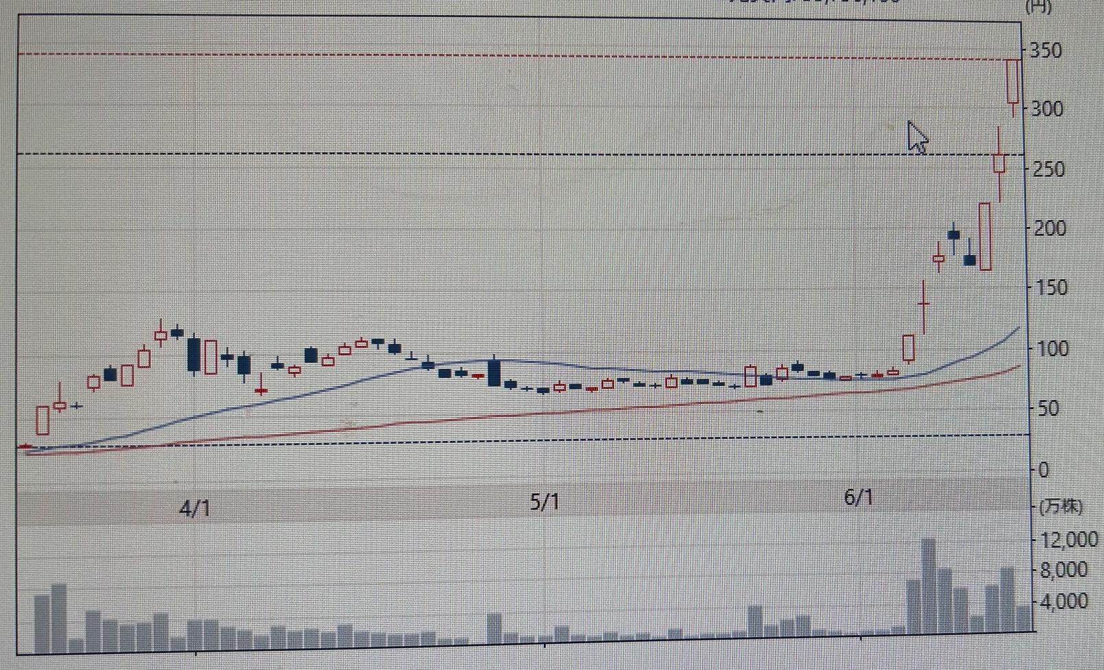 さて、先週は「ANAPホールディングス」(3189。東証スタンダード。東京都港区)が暗号資産(仮想通貨)を利用したIRで急騰。これまで暗号資産に関するIRの噂は他の銘柄でもあったが、増資に活用はインパクトがあった。ANAPが動意づいて来たのは5月中旬からだが、昨年末に少し上昇し、今年2月中旬までもみ合い。それからまた少し上昇し、5月中旬までもみ合い。ほとんど崩れることはなかった。これは過去の増資分を少しずつ売っていた一方で、買い集めていた投資家がいたということだろう。