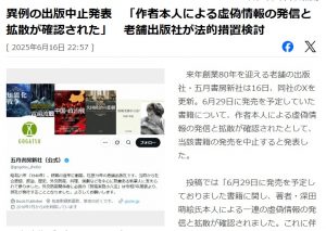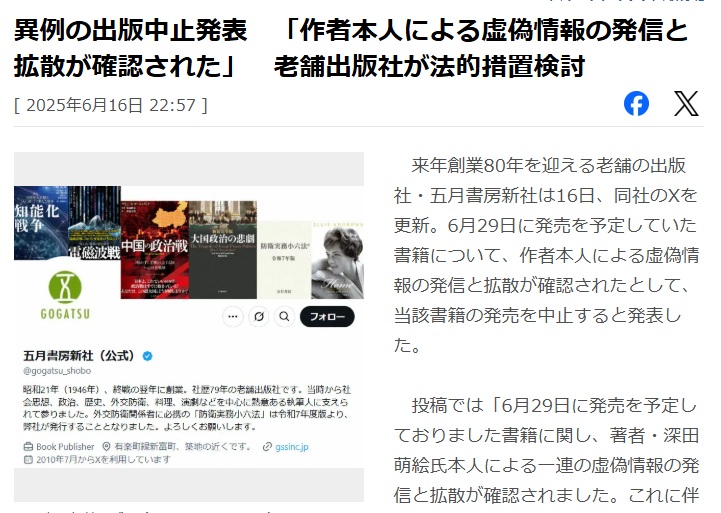 既報道によれば、五月書房新社は6月29日、深田氏らとの間で、『ビッグ・プロット――浙江財閥の世界支配百年計画』なる書籍を出すことになっていたが、突如、深田氏が自身のYouTubeで書籍内容を改ざんされた、五月書房新社は中国共産党の工作機関だ、旨のことを一方的に言い出したことから、出版を中止すると共に、法的処置を取るという。(横写真=「スポニチアネックス」6月16日22:57)