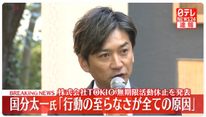 大手マスコミ既報のように、人気アイドルグループ「TOKIO」のメンバー、国分太一(50)が副社長で、同グループのマネジメントを行う芸能事務所㈱「TOKIO」(代表は城島茂。東京都港区)は6月20日、国分のすべての活動を無期限で休止すると発表した。