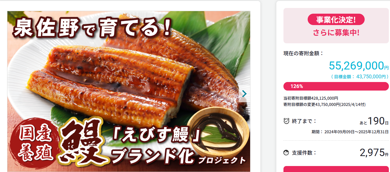 これは泉佐野市が立案したのではなく、「大黒水産」(経営会社は「あおい企画」大阪府羽曳野市。辻純代代表)が市に持ち込み同市がこれに乗ったもの。結果、冒頭写真のように、同市のふるさと納税寄付サイトで2024年9月9日から寄付を募ったところ、すでに当初目標の4375万円を突破し、5526万9000円も集まっている(6月24日現在)。