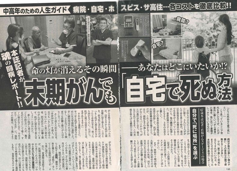 学生時代から『週刊大衆』を手伝い、同誌との関わりは実に40年近く。特に健康ものに精通し、死の11日前に発売になった同誌の記事「末期がんでも自宅で死ぬ方法」(4P)を一人で書き上げたのが最後の記事で、その記事内容通り、本人の希望で自宅で家族に見守られながらの大往生だった。