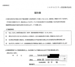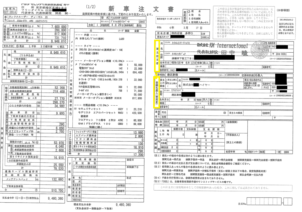 それもそのはず。これらはまったくの詐欺話で、KMは信用させるために同社を買主、被害者を登録名義人とする「新車注文書」を被害者側に見せていた(右横写真)が、実際にはトヨタ自動車直営の販売会社・トヨタモビリティ東京には注文されてなく、したがって、払い込みもされてなく、KMが被害者の入金分をそのまま横領していた模様なのだ。