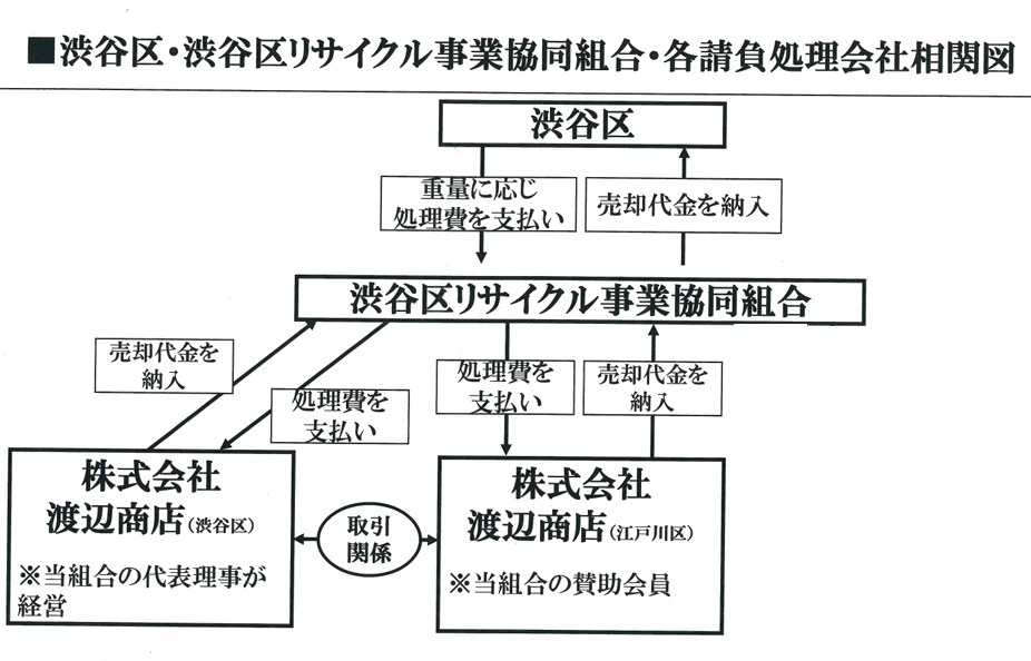 江戸川渡辺商店を始めとする組合加入業者は、回収した資源ごみをリサイクル施設に持ち込む際、アルミ缶、スチール缶、新聞、雑誌、段ボールなど毎に単価が異なるので各計量し、それに応じて換金されるが、これら資源ごみは渋谷区の財産で、全額、渋谷区に納められることになっている。