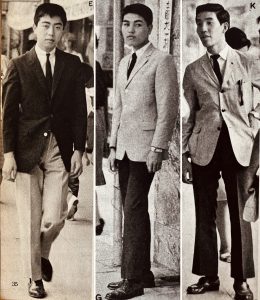 こちとらが中学生の頃は、周りのお兄さんたちはアイビーが主流で、まずヘアースタイルはきちんと横分け、バイタリスとかMG5なんかのヘアリキッドとかチックで形をつくる。ボタンダウンのシャツに、三つボタンのブレザー、セーター、ポロシャツ、コットンパンツ、革靴と、スカしやがって、これでモテようって魂胆に見えた。このアイビールックを先導したのが、あのVANである。周りでも、カッコつけ中高生たちはVANがどうしたとか盛り上がっていたが、こちとらダサイ系中高生組だったので関係なかった。