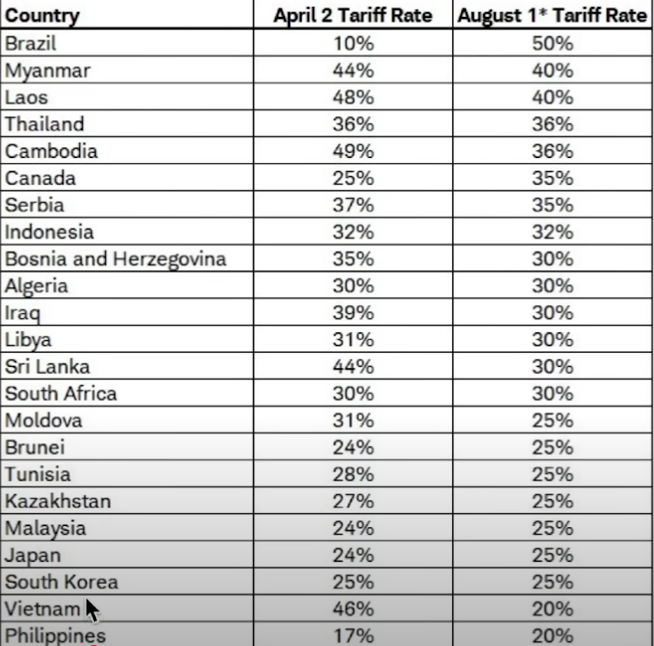 4月2日の解放の日までは左に記す関税率だったが、今回の8月1日までを期限とする関税率は右のように変化している。この図にはないが、昨日EUにも30%の追加関税が付与された(※一律関税は別に10%かかっている)
