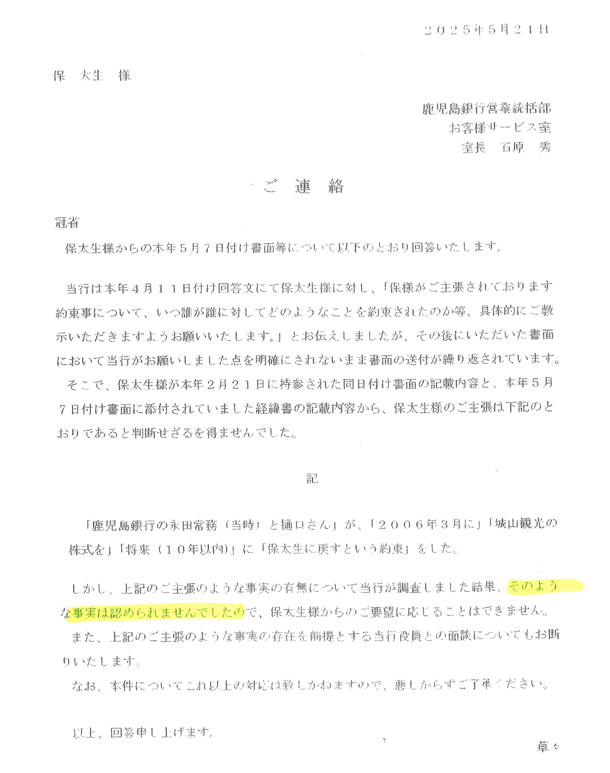 1回目の記事では触れなかったが、そもそも、鹿児島銀行との間では、保氏が城山観光の代表取締役社長を退任する(2006年1月)に当たり、それから10年を目途に城山観光の株式を戻す(=創業家一族が代表に復帰)との約束があったという(鹿児島銀行側は否定=右下写真参照のこと)。それが事実なら2016年には実行されていないとおかしいが、約束は履行されず、挙句、最大の資金源だったパチンコ部門を子会社化され、時価の3分の1の超安値で九州外の企業に売却される。