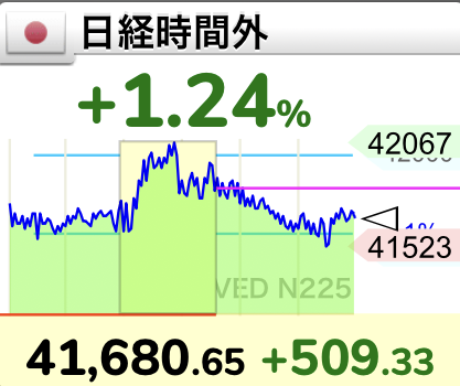 先週金曜日の日経平均株価の終値は、41,456円と前稿比+1,637円(※前項比+249→ ▲241→ ▲348→ +1748→ +569→ +92→ ▲223→ +805→ +594→ +251→ +672→ +1125→ +976→ +1144→ ▲195→ ▲3339→ ▲557→ +624 →+166 →▲269→▲1621→ ▲372→ +362→ ▲785→▲360→+1481→▲739→▲705→+193円(大納会))となった。その後日経平均先物は41,360円で引けている。