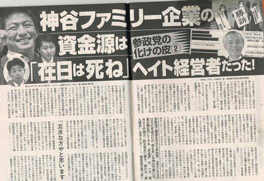 現在発売中の『週刊文春』が、3P割いて、先の参議院選挙で改選1議席から一挙に14議席獲得した「参政党」側への資金源の一人は、「在日は死ね」と公言するヘイト経営者であることをスッパ抜いている。