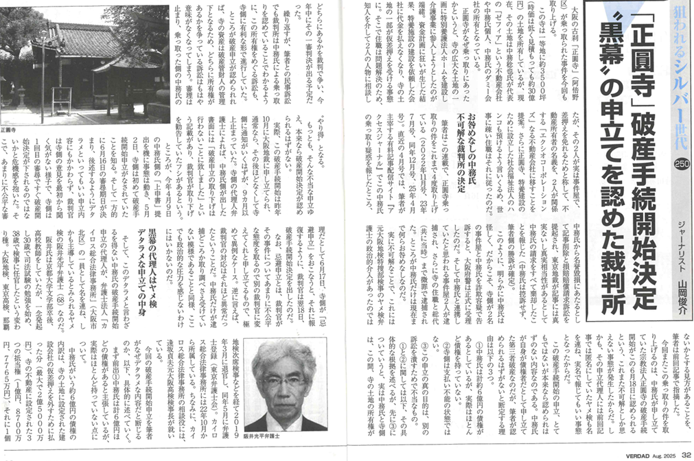 宗教法人「正圓寺」の破産手続申立をデタラメな理由でやり、しかも、なぜかその申立が6月18日に認められたことだ(これに対し、お寺や債権者2人が抗告中)。