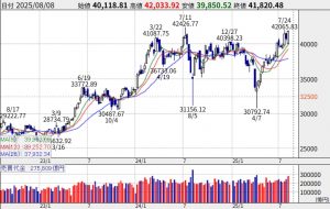 先週金曜日の日経平均株価の終値は41,820円と、前稿比+1,020円(※前項比▲656→ +1637→ +249→ ▲241→ ▲348→ +1748→ +569→ +92→ ▲223→ +805→ +594→ +251→ +672→ +1125→ +976→ +1144→ ▲195→ ▲3339→ ▲557→ +624 →+166 →▲269→▲1621→ ▲372→ +362→ ▲785→▲360→+1481→▲739→▲705→+193円(大納会))となった。