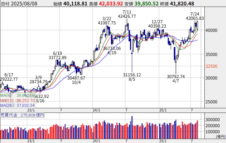 その夜、日経平均先物はさらに上昇し一時42,390円まで上昇したものの、42,285円で週を終えている。※2025年の最安値は4月7日(月)30,793円。2024年8月5日は31,156円のフラッシュクラッシュがあった。