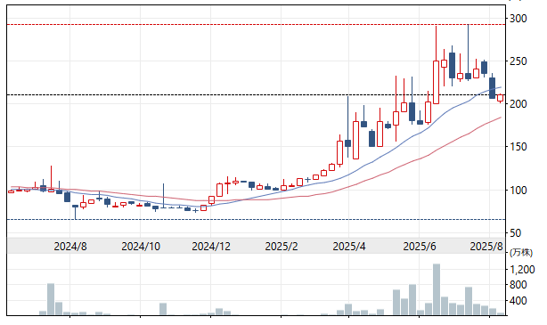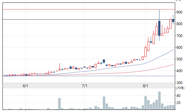 8月になって千葉県と茨城県で無料情報紙発行「地域新聞社」(2164。東証グロース。千葉県八千代市)が急騰している。また、今年初めから「北紡」(旧「北日本紡績」。今年7月社名変更。3409。東証スタンダード。石川県白山市)も大幅高となっている。