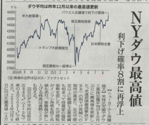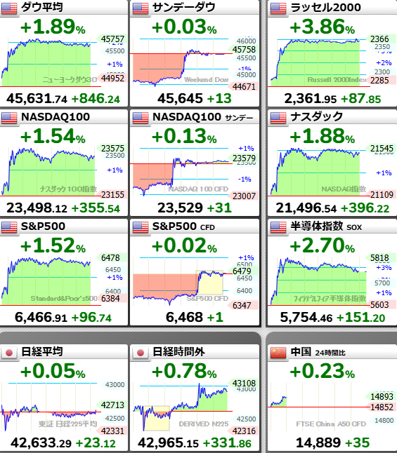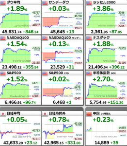 NYダウは、週間で+686ドル高となる45,632ドル(※前稿比+770→+587→▲1313→+560→▲30→▲457→+1010→+1612→▲565→+493→+667→▲1052→+1406→▲68→+1203→+972→▲1071→+1898→▲3269→▲401→+497→▲1314→▲1039→+413→▲1,118→+243→▲242→+121→+936→+1550→▲794→+151→▲259)。※最高値は2024年12月5日の45,074ドル。※4月7日に36,612ドルが直近最安値。
