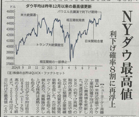 先週の金曜日PM23:00のジャクソンホールシンポジウムで、パウエル議長は利下げ期待を高める発言をした結果、米国株は4指数ともに大きく上昇したが、日経平均株価は為替が円高になった影響もあり、43,000円を拒絶するかのような弱い値動きに終始して場を終えている。