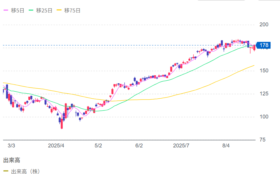ただ決算前にして、特に先週に目標株価引き上げが9社もあったようで、その結果市場関係者の9割までが、同社株への判断を買いとしており、目標株価のコンセンサスは194ドルとなってしまっている。ここまで読んで以下の画像をよく見てほしい。目標株価引き上げが直近9社あって、この株価の推移である。