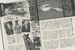 独占スクープだとして、「野党大物国会議員『シャブ逮捕』のXデー」、「選挙戦の最中に美女をはべらせてあぶり吸引していた」とのタイトルで報じているからだ。