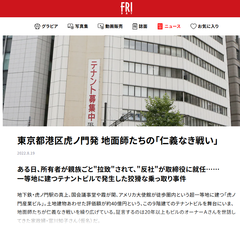 この抵当権にしろ、役員就任にしろ、正当なものでないことが、その後の訴訟で明らかになるのだが、22年8月には、写真週刊誌『フライデー』が「地権者が“拉致”され…東京・虎ノ門地面師達の『仁義なき戦い』」の見出しで報じる。そう、上田一族のY氏が、同年4月、若い男に「散歩に行きましょう」と連れ出され行方不明に。Y氏は知的障害を持っている。そして、行方不明の翌日の日付で、Y氏は赤坂2丁目に自宅を持つが、その住所が千葉県市川市の借家に移転、また、赤坂の自宅に2億円の抵当権が設定された(その後、第3者に売却に)。同じく前出X氏も所在不明に。