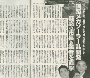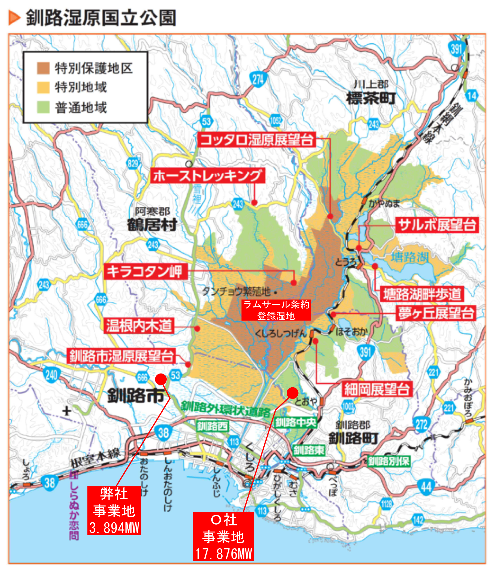 その規模は、日本エコロジーの北斗地区での計画(3・894メガ)の4倍以上の17・876メガ。その大きさ、しかも国立公園内であることを考えれば、日本エコロジーよりはるかに大きな環境破壊が想定されたはずだ。しかし、今回のような激しいバッシングはないどころか、釧路町協力の元(敷地は町が貸与)、建設され、開所式には釧路町長ら町の関係者も多く出席し「自然環境に配慮したメガソーラー」だとして祝っている。