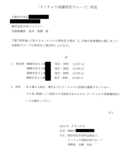 一方、「北斗」地区での開発についても、市からの要請を受け、タンチョウヅルの営巣は確認されないとの報告を、タンチョウの第一人者であるNPO法人「タンチョウ保護研究グループ」(釧路市。百瀬邦和理事長)にもらい提出している。この結果、釧路市より太陽光ガイドラインの受理(*わかり易く言うと基本、工事を進めていいということ)を取得している。