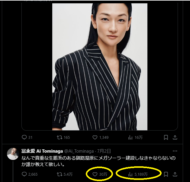 「なんで貴重な生態系のある釧路湿原にメガソーラーを建設しなきゃならないのか」とモデルの冨永愛が7月2日にXすると、登山家の野口健氏が「一緒にアクションをおこしませんか」と現地視察を提案する(8月18日)など反響大きく、冨永のそのインプレッション数は現在、実に5189万、「いいね」が30万付いており、爆発的に拡散したことがわかる。