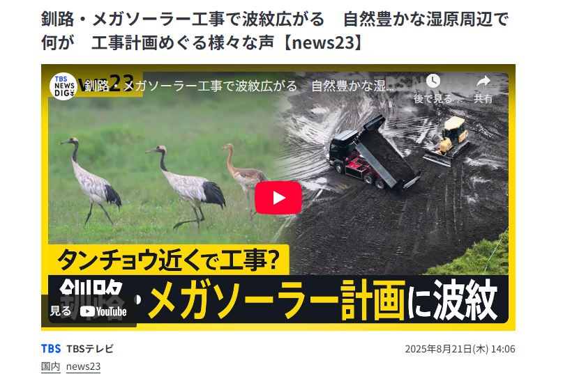 まして、今回槍玉に上がっている釧路湿原は国指定の天然記念物・タンチョウヅル、オジロワシなどが生息する貴重な場所なのだから、そこでのメガソーラ(大規模太陽光発電施設)建設には反対の立場だ。