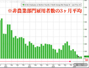 この数字、仮に少し上振れて96万人のマイナス(※昨年は82万人のマイナス改定だったが)となった場合、月間で-8万人の減少となるが、まぁこの頃は15万人以上の雇用増が普通だったからまぁ大丈夫かな。そもそも、これは過去の数字の改定だから本来は問題にならないところだが、2025年に関しては8月までの雇用者数増は+約60万人。特に直近の3カ月は2.9万人だということもあり、これが下方修正されるとなると、【これ、米国では雇用を生み出せていないんでは】と疑念が渦巻く。そもそも2025年に入ってからの月次雇用統計の雇用者数はカシュカリ総裁が言う、均衡点にはとうてい及ばないんだが?