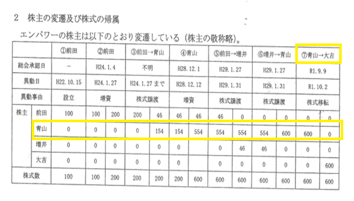ちなみに、エンパワーの株主に関しても、左横写真のように、変遷しているものの、最終手的には青山個人から、青山が100%株主の「大吉」に移っており、矛盾はない。