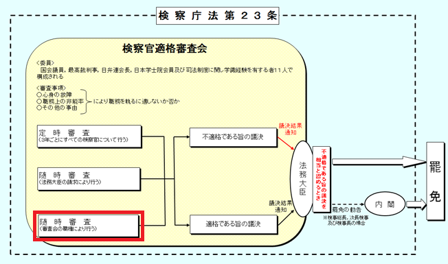 国会議員6名、最高裁判事1名、日弁連会長など計11名から構成されており、3年に一度、全検察官につき職務を執るに適しているか審査しているが、これとは別に、各検察官について随時審査を行う場合もあり、その申立ては国民なら誰でも出来る(*両氏の解説YouTubeはココをクリックすれば観れる)。