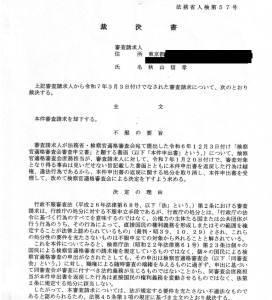その際、前回申立は、適格審査会で審査する以前に、審査会窓口の庶務担当者から門前払いされた(*左横写真は、これを不服として、3月3日、審査をキチンとしろと求めた文書に対する法務省の「裁決書」)。