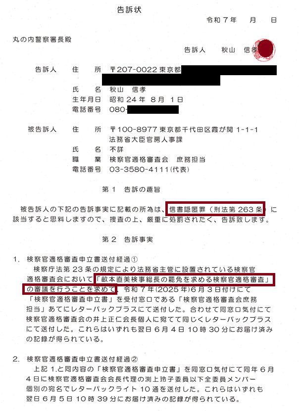 そうした対応から、秋山氏らは、審査会庶務担当が「畝本検事総長の適格審査を議題から外すため、委員11人宛の書状(*レターパック)を受け取りながら、故意に隠し、処分した」と判断。8月21日、秋山氏らは「信書隠匿罪」(刑法第263条)で警視庁丸の内署に告訴(右横写真)。だが、これもすぐ「犯罪が確定していないので刑事告訴に馴染まない」旨で訴状は受け取ってもらえなかったという。
