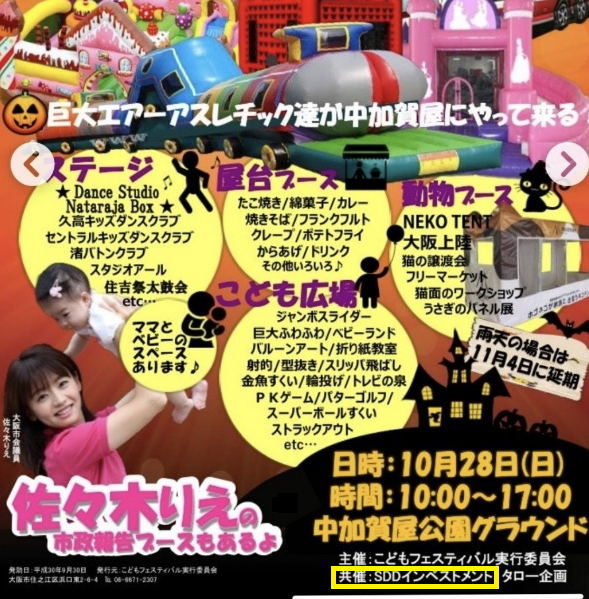 また、佐々木氏が参院議員になった直後、『週刊ポスト』もネット版の方で報道。こちらも林氏の名は伏せているが、『週刊現代』で報じていなかった、佐々木氏が市議時代、地元・住之江区で開催していた「こどもフェスティバル」(2017年~19年)の共催相手が、疑惑の投資を募っていたSDDインベストメント自体だった事実(左下写真はそのポスター。その右下、黄色マーカー囲みに「共催 SDDインベストメント」の表記)などを報じている。
