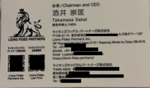 冒頭左写真のように、王冠を被った百獣の王・ライオンのロゴを付けた「ライオンズフィデス・パートナーズ」という社名の名刺を差し出す酒井嵩匡なる者(冒頭右写真)にご注意! 会社乗っ取りの事件屋だからだ。
