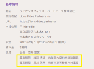 HPを覗くと、最高顧問には安倍政権の時、検察トップの検事総長目前で麻雀賭博で辞めたあの黒川弘務元東京高検検事長、それに昨年の衆院選で落選したものの安倍・岸田政権で2度に渡り復興大臣を務めた渡辺博道元衆議院議員の名前が。