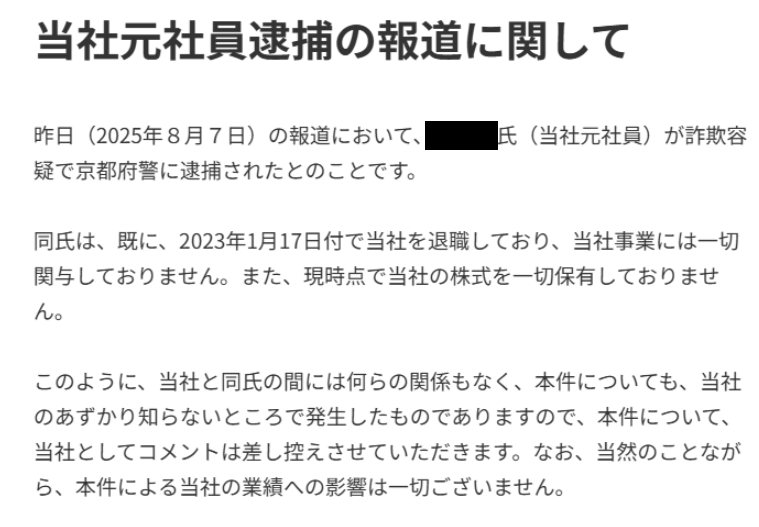 ところが、右下に転載したのは、S氏が逮捕された翌日に出したエフ・コードのIRだが、すでにS氏は退職し、自社株も保有していないから、自社とは何ら関係なく、「本件については、当社のあずかり知らないところで発生したもの」として、コメントを差し控えた。