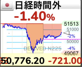 先週金曜日の日経平均株価の終値は、50,276円と前稿比-2,135円(※前項比+3,111→+1718→▲507→ +2,319→ +415→ +587→ +1749→ +301→ +85→ +▲745→ 1558→ +1020→ ▲656→ +1637→ +249→ ▲241→ ▲348→ +1748→ +569→ +92→ ▲223→ +805→ +594→ +251→ +672→ +1125→ +976→ +1144→ ▲195→ ▲3339→ ▲557→ +624 →+166 →▲269→▲1621→▲372→+362→▲785→▲360→+1481→▲739→▲705→+193円(大納会))となった。