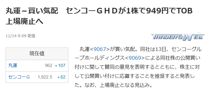 先週、「丸運」(9067。東証スタンダード。東京都中央区)を3PL(物流一括受託)大手「センコーグループホールディングス」(9069。東証プライム。東京都江東区)がTOBすると発表した。昨年夏に「ENEOSホールディングス」(5020。東証プライム。東京都千代田区)がTOBするとの情報が流れており、中国系仕手筋は大量に買い付け。