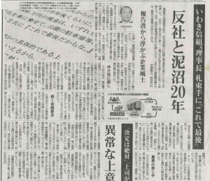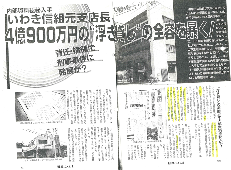 「食い込んだのは、東京電力だけではない。地元のいわき信金組合の不正を追及する記事を90年代、盛んに書いた(右横写真)のはいいとして、その後、同行に食い込み、最終的に30数億円の情実融資を引き出し、すべて焦げ付かせた疑惑も出ている。